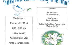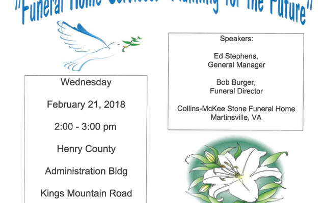 Funeral Home Services: Planning for the Future. Event is free, open to all seniors, no registration required, and refreshments will be served. Event is located at the Henry County Administration Building on Kings Mountain Road in Martinsville, VA. For more information call SAAA at (276) 632-6442 of toll free at (800) 468-4571.