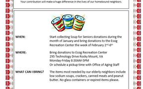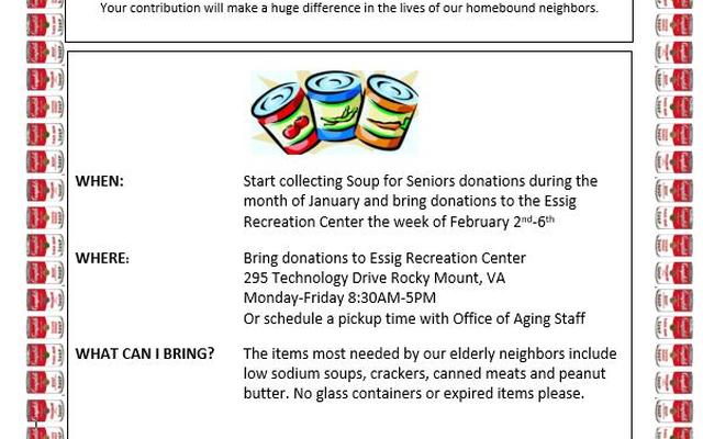 Soup for Seniors Food Drive! Franklin County Parks and Recreation Aging Services annual food drive event needs your donations. Start now to gather donations! Deliver donations to the Essig Center February 2nd to 6th. To find out more call (540) 483-9238.
